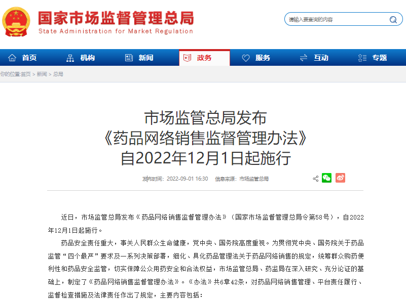近日,市場監管總局發布《藥品網絡銷售監督管理辦法》(國家市場監督管理總局令第58號),自2022年12月1日起施行。