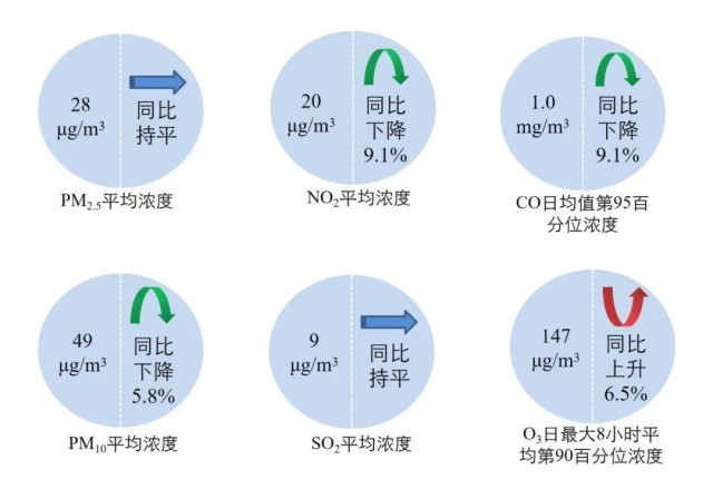 11月,全國339個地級及以上城市平均空氣質量優良天數比例為91.9%,同比上升3.8個百分點;PM2.5平均濃度為34微克/立方米,同比下降5.6%;PM10平均濃度為57微克/立方米,同比下降13.6%;O3平均濃度為99微克/立方米,同比上升6.5%;SO2平均濃度為9微克/立方米,同比下降10.0%;NO2平均濃度為26微克/立方米,同比下降13.3%;CO平均濃度為1.0毫克/立方米,同比下降9.1%。