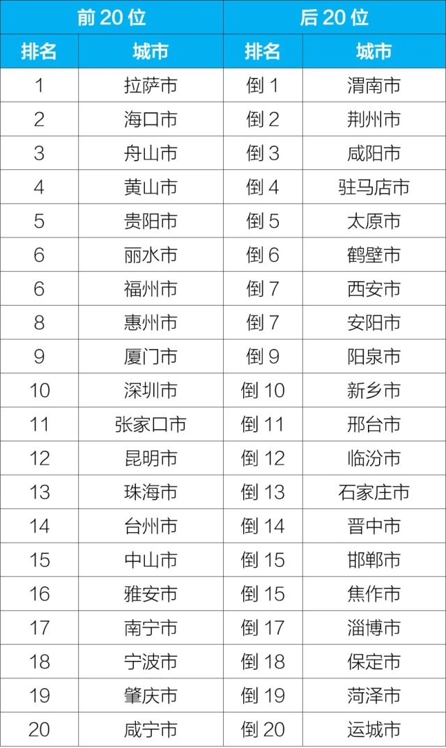 11月,168個重點城市中,拉薩、海口和福州市等城市空氣質量相對較好(從第1名至并列第19名);渭南、咸陽和安陽市等城市空氣質量相對較差(從倒數第1名至倒數第20名),見附表1。