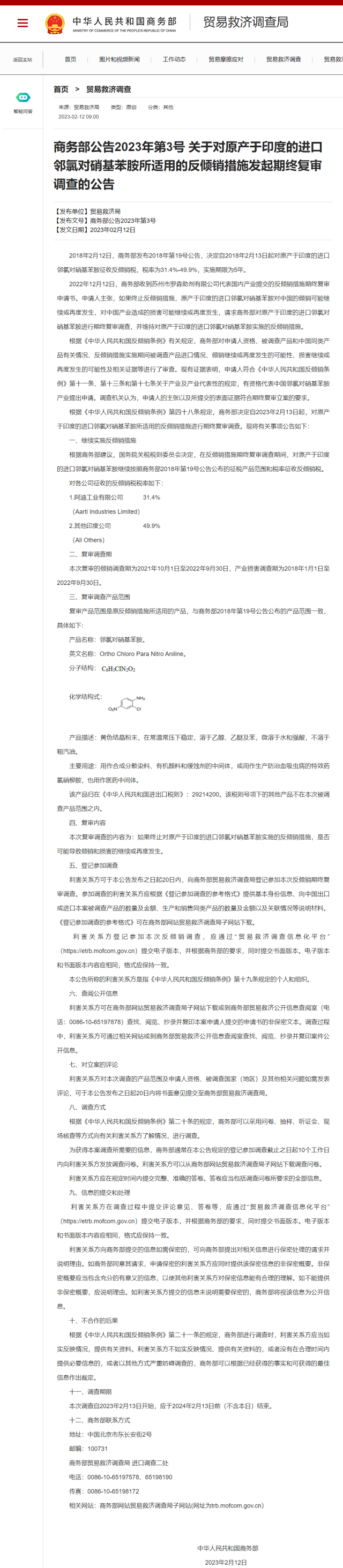 央視網(wǎng)消息:2月12日,商務(wù)部網(wǎng)站發(fā)布公告,決定自2023年2月13日起,對原產(chǎn)于印度的進口鄰氯對硝基苯胺所適用的反傾銷措施進行期終復(fù)審調(diào)查。根據(jù)商務(wù)部建議,國務(wù)院關(guān)稅稅則委員會決定,在反傾銷措施期終復(fù)審調(diào)查期間,對原產(chǎn)于印度的進口鄰氯對硝基苯胺繼續(xù)按照商務(wù)部2018年第19號公告公布的征稅產(chǎn)品范圍和稅率征收反傾銷稅。