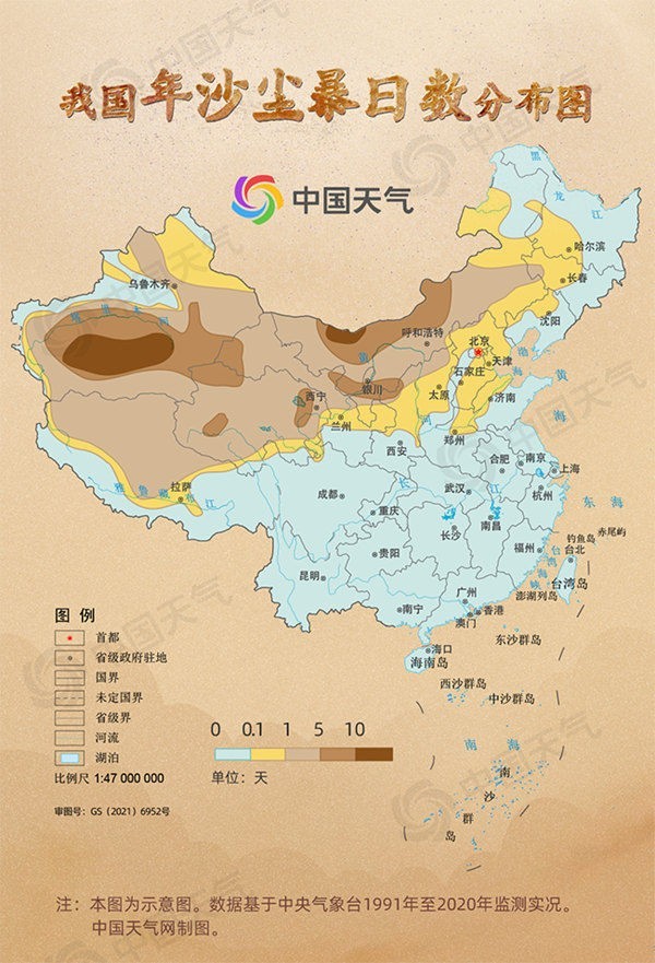 記者統計1991年至2020年來,我國沙塵暴日數的分布情況,可以看出沙塵天氣主要影響我國北方地區,其中,南疆盆地和內蒙古西部兩地是沙塵暴的高發區,年沙塵暴日數在10天以上,部分地區超過20天。