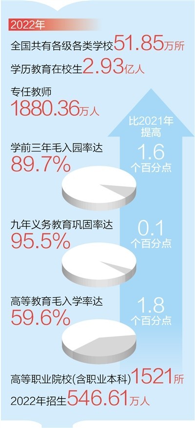 ——普及鞏固水平進(jìn)一步提升。全國學(xué)前三年毛入園率達(dá)到89.7%,比2021年提高1.6個(gè)百分點(diǎn);九年義務(wù)教育鞏固率達(dá)95.5%,高中階段毛入學(xué)率達(dá)到91.6%。