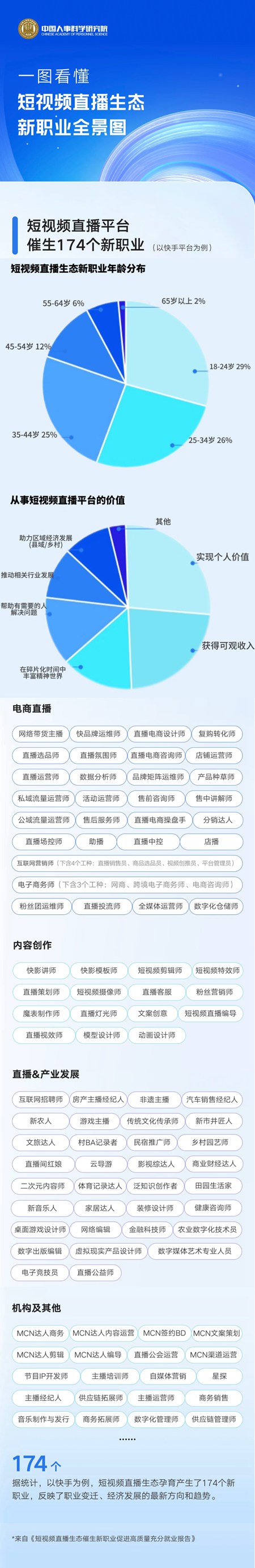 中國人事科學研究院近期發布的《短視頻直播生態催生新職業促進高質量充分就業報告》顯示,一塊屏幕背后發生了諸多變化:中青年成短視頻直播生態新職業的主力軍。其中,18-24歲占29%,25-34歲占26%,35-44歲占25%。18-34歲占比達到55%?!吨腥A人民共和國職業分類大典(2022年版)》的1639個職業中,短視頻平臺快手覆蓋八成以上的數字職業,為勞動者提供了更廣闊的職業發展空間。
