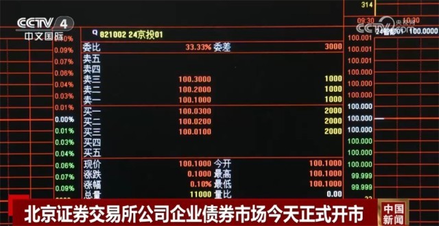 央視網消息:1月15日上午,北京證券交易所公司企業債券市場正式開市。開市首日,北交所公司企業債券市場上市3只企業債券,債券發行規模合計24.8億元。