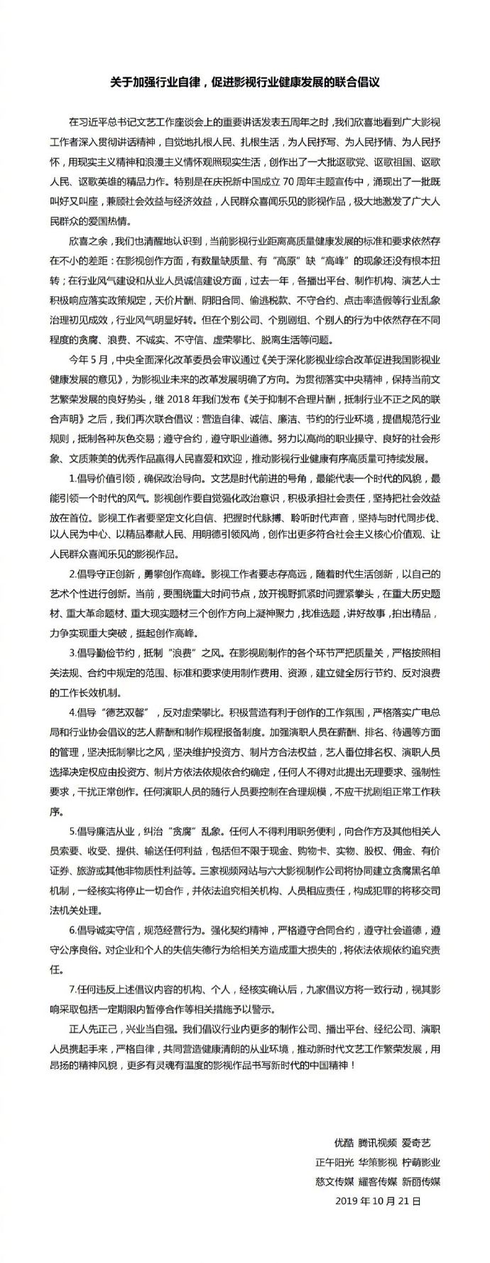 為了避免娛樂圈的爭番、攀比等亂象,業界公司曾聯合發布自律倡議。2019年,優酷、騰訊視頻、愛奇藝三家視頻網站,聯合正午陽光、華策影視、檸萌影業、慈文傳媒、耀客傳媒、新麗傳媒六大影視制作公司,共同發布《關于加強行業自律,促進影視行業健康發展的聯合倡議》。