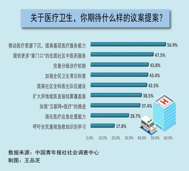 每年全國兩會,醫療衛生都是代表委員們熱議的話題。在全國兩會召開前夕,中國青年報社社會調查中心聯合問卷網(wenjuan.com),進行了全國兩會青年期待調查,共有2002人參與。調查顯示,在兩會關于醫療衛生領域的議題中,56.9%的受訪者最期待推動醫療資源下沉,提高基層醫療服務能力,47.5%的受訪者期待提供更多“家門口”的優質社區中醫藥服務。