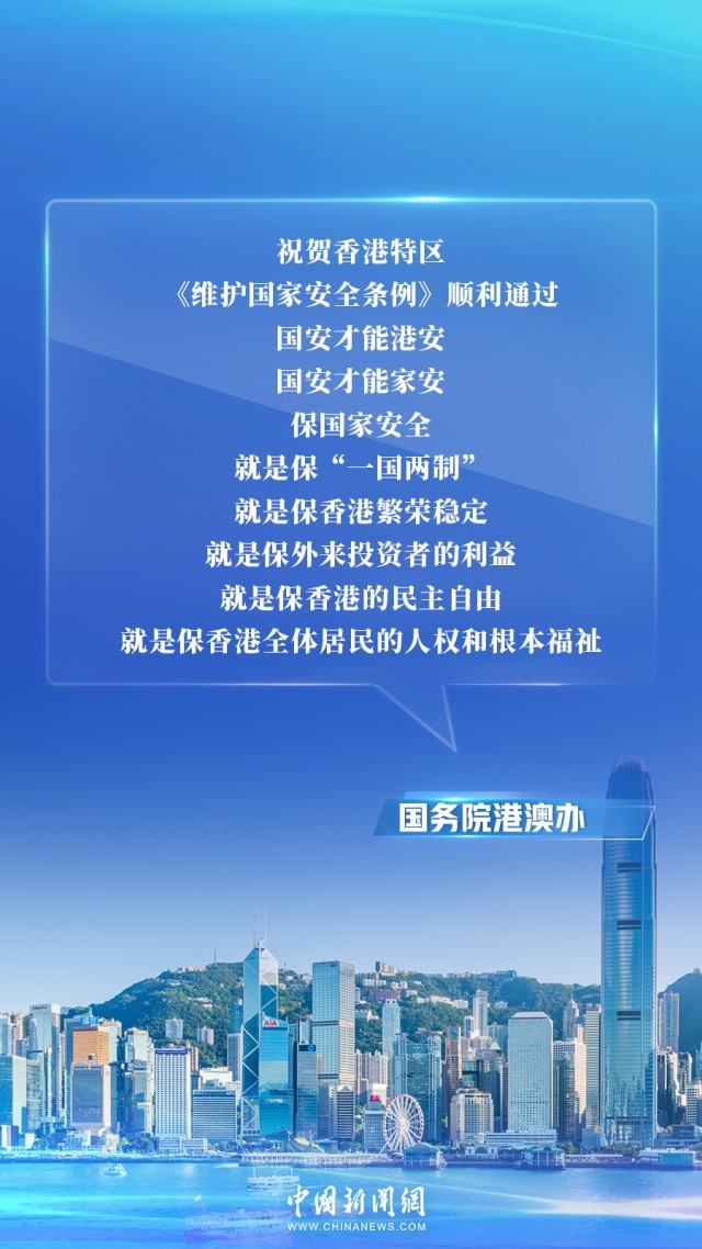 國務院港澳辦強調,香港國安條例順利通過,為保持香港長期繁榮穩定、推動“一國兩制”實踐行穩致遠提供更加堅實的制度保障。香港國安條例全面有效維護國家安全,充分尊重和保障人權,更好統籌發展和安全。