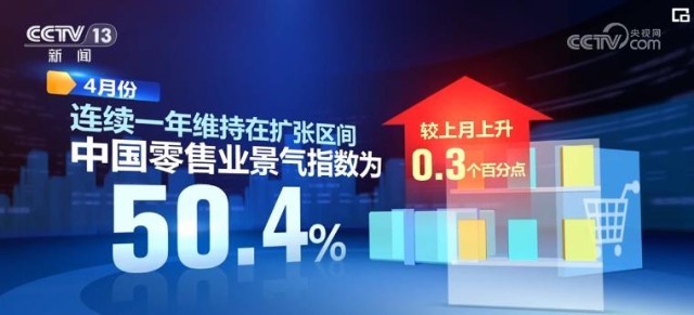 中國商業聯合會最新發布的中國零售業景氣指數顯示,4月份,中國零售業景氣指數為50.4%,較上月上升0.3個百分點,連續一年維持在擴張區間。從行業分類看,商品經營類指數、租賃經營類指數、電商經營類指數較上月均有上升。