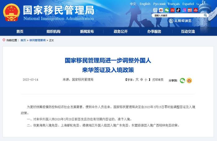 中新網3月14日電 據國家移民管理局網站消息,為更好統籌疫情防控和經濟社會發展需要,便利中外人員往來,國家移民管理局決定自2023年3月15日零時起調整簽證及入境政策。