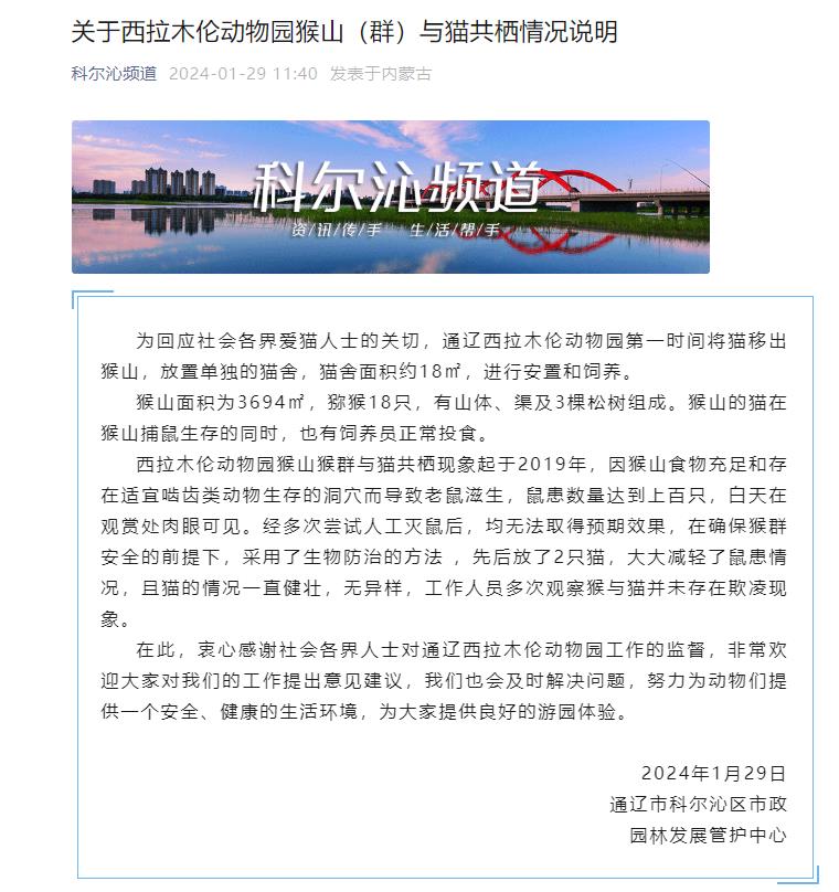 中新網1月29日電 據內蒙古通遼市科爾沁區融媒體中心微信公眾號消息,通遼市科爾沁區市政園林發展管護中心29日發布《關于西拉木倫動物園猴山(群)與貓共棲情況說明》(下稱“情況說明”)。情況說明顯示,通遼西拉木倫動物園已第一時間將貓移出猴山,且貓的情況一直健壯,無異樣,工作人員多次觀察猴與貓并未存在欺凌現象。全文如下: