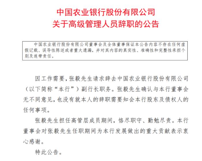 中國農業銀行也人事變動不斷。21日,農行公告稱,因工作需要,張毅請求辭去中國農業銀行副行長職務。