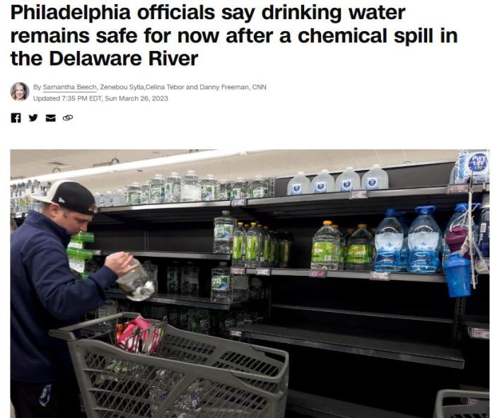 中新網(wǎng)3月27日電 綜合外媒報道,近日,美國賓州布里斯托爾一家工廠發(fā)生泄漏事故,大量化學(xué)物質(zhì)流入特拉華河一條支流中。事故發(fā)生后,費城官員建議當(dāng)?shù)孛癖娛褂闷垦b水,引發(fā)恐慌性購買。
