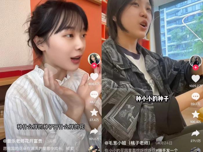 中新網查詢了她們在短視頻平臺上最早發布時間,桃子老師是在4月24日,黃老師是在4月28日。