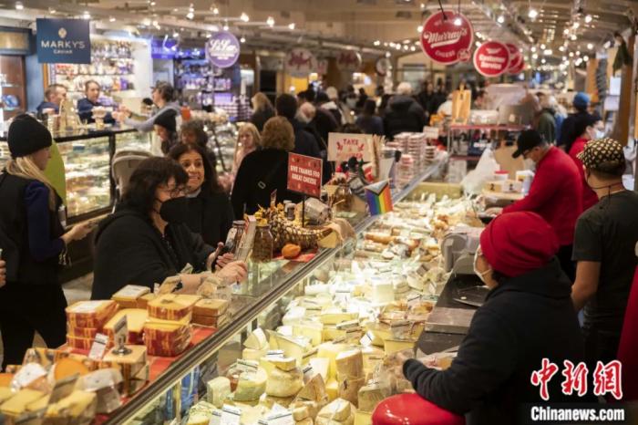2022年冬季,顧客在紐約中央車站市場詢問奶酪價格。美國在當年遭遇了40年來最嚴重的通貨膨脹。消費者價格指數(CPI)同比漲幅在6月達到9.1%的峰值后,一直保持在7%以上的高位,持續“高燒”的通脹令經濟承壓。廖攀 攝
