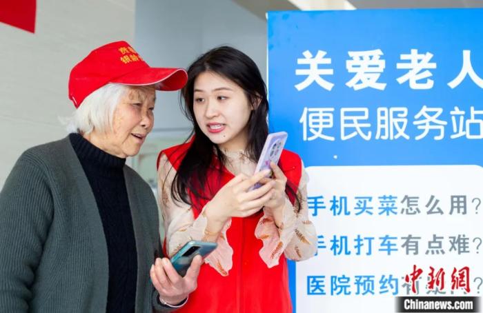 在江蘇省海安市大公鎮便民服務中心開設的老年人手機公益課堂上,志愿者指導老年人如何使用智能手機。翟慧勇 攝
