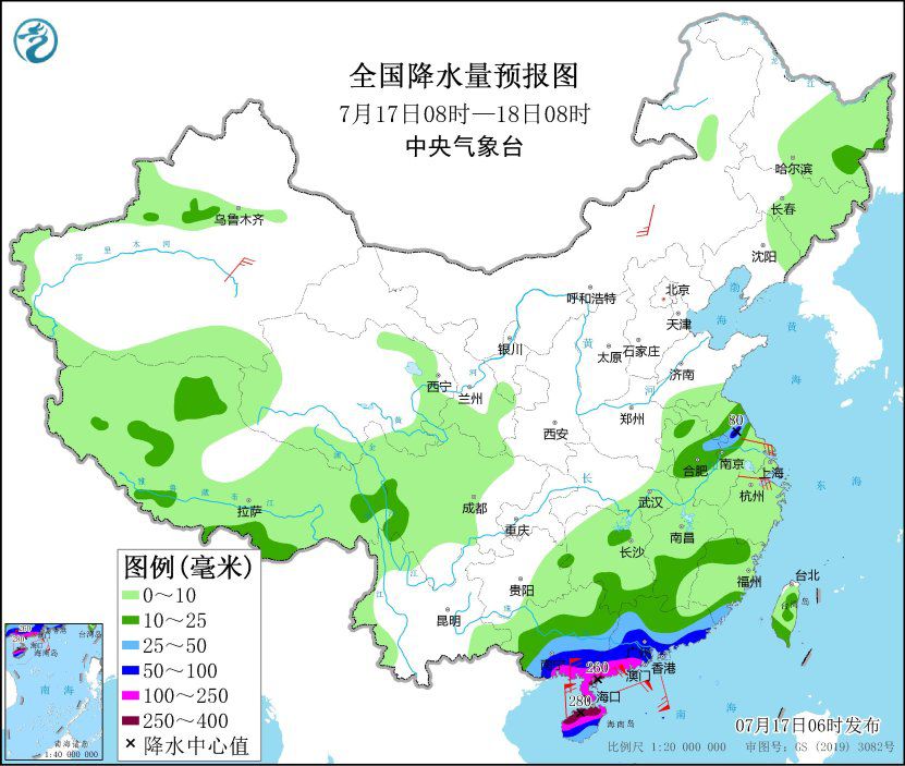 同時,廣東西部和南部、廣西中南部、海南島、福建南部等地部分地區(qū)有大到暴雨,其中,廣西南部、廣東西南部、海南島中北部等地部分地區(qū)有大暴雨,廣東西南部沿海、海南島北部等地局地特大暴雨(250~280毫米)。