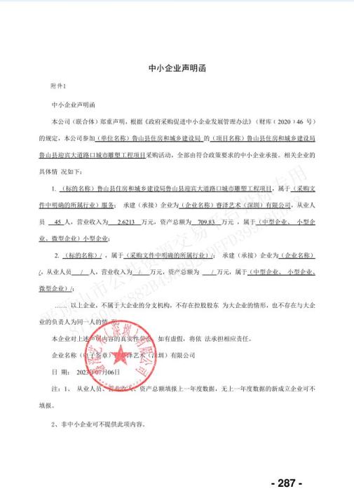 中標公告所附的中小企業(yè)聲明函顯示,睿澤藝術(深圳)有限公司從業(yè)人員45人,營業(yè)收入2.6213萬元,資產總額為709.83萬元。