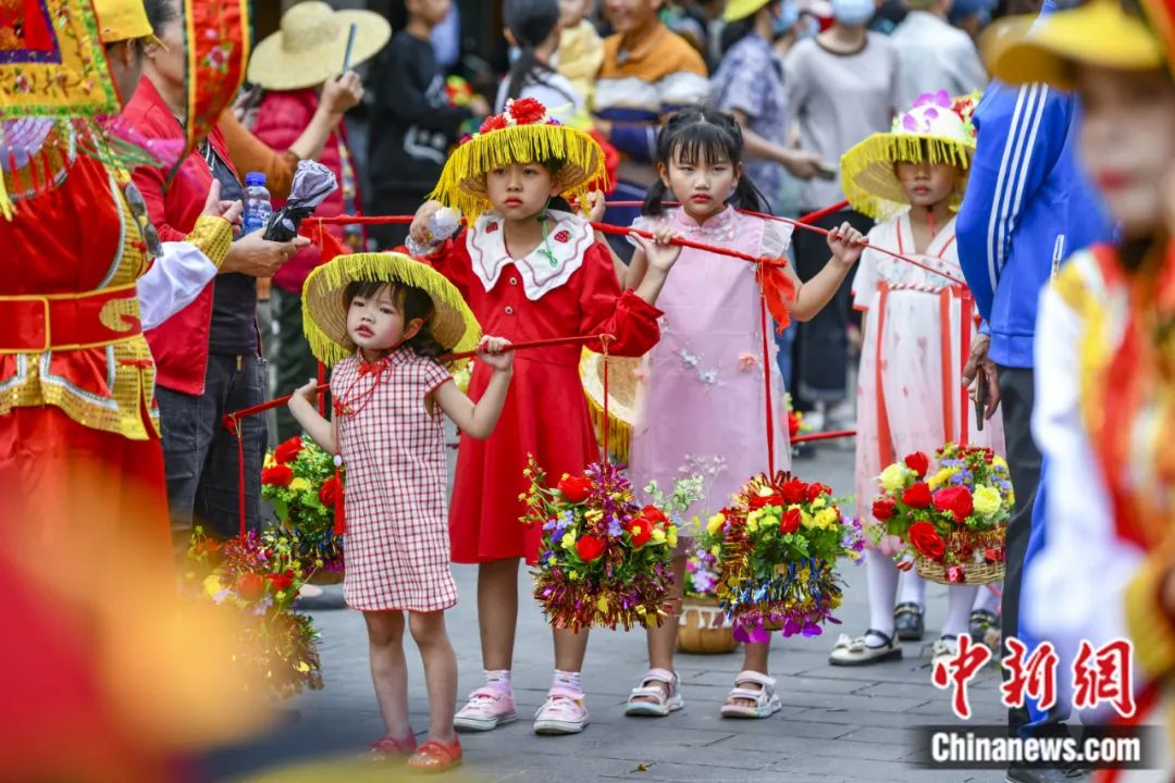 2023年2月28日,第二十二屆海口冼夫人文化節(jié)(原稱軍坡節(jié))之“裝軍巡游”活動在海南海口新坡鎮(zhèn)舉行。圖為在活動中肩挑花籃的小女孩。駱云飛 攝