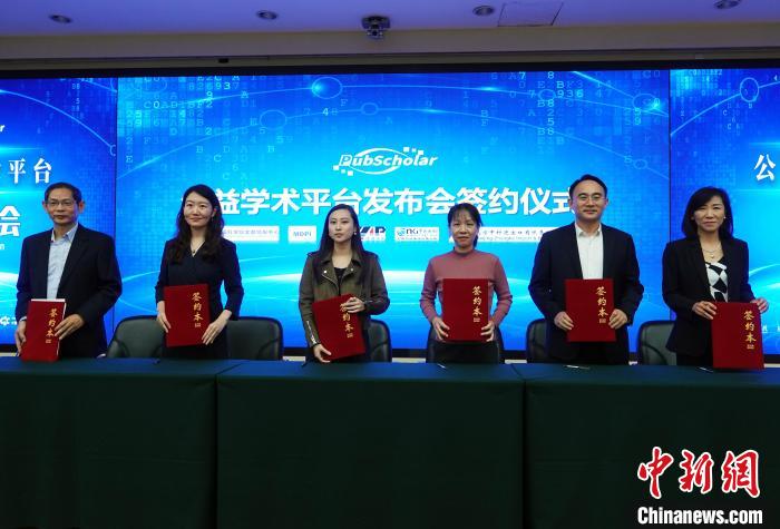 11月1日,“PubScholar公益學術平臺”在中國科學院文獻情報中心正式發布,并在發布會上舉行相關合作簽約儀式。中新網記者 孫自法 攝