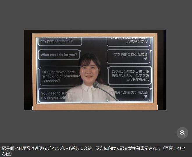 該顯示屏被設(shè)置在西武新宿站正面入口特快售處的“外國乘客咨詢臺”附近,使用時間是從7時至20時。車站工作人員和乘客可以通過透明顯示屏顯示出的翻譯內(nèi)容進(jìn)行對話。
