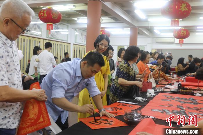 當地時間28日上午,這些書法愛好者齊聚印尼書畫學院,參加“‘龍’福齊天——甲辰龍年新春大團拜”活動。活動由印尼書法家協會和印尼書畫學院聯合舉辦。