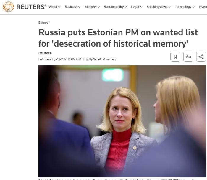 中新網(wǎng)2月13日電 據(jù)路透社13日援引俄內(nèi)政部消息,俄方將愛(ài)沙尼亞總理卡拉斯列入通緝名單。
