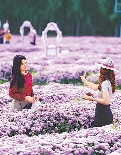 中國游客在泰國曼谷都會區的松樹天堂陽光公園拍照打卡。