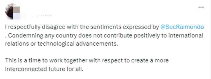 還有網友表示,譴責任何國家,不會對國與國之間的關系和科技進步帶來積極貢獻,“現在是時候共同努力,為所有人創造一個更好溝通的未來。”