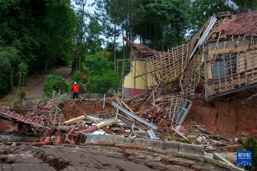 3月4日,一名男子在印度尼西亞西爪哇省的山體滑坡現場查看情況。新華社發(塞提安賈爾攝)