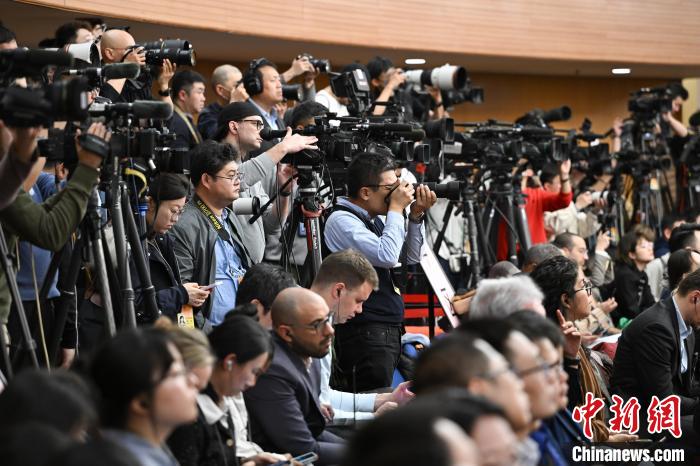 3月6日,十四屆全國人大二次會議在北京舉行記者會,國家發展和改革委員會主任鄭柵潔、財政部部長藍佛安、商務部部長王文濤、中國人民銀行行長潘功勝、中國證券監督管理委員會主席吳清就發展改革、財政預算、商務、金融證券等相關問題回答中外記者提問。圖為中外記者在現場采訪。 中新社記者 何蓬磊 攝