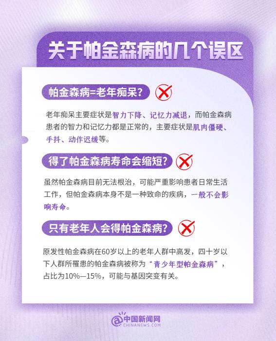 中新網4月11日電 帕金森病是威脅老年人健康的“沉默殺手”。帕金森病=老年癡呆?得了帕金森病壽命會縮短?只有老年人會得帕金森病?今天是世界帕金森病日,這些有關帕金森病的小知識,一起了解!