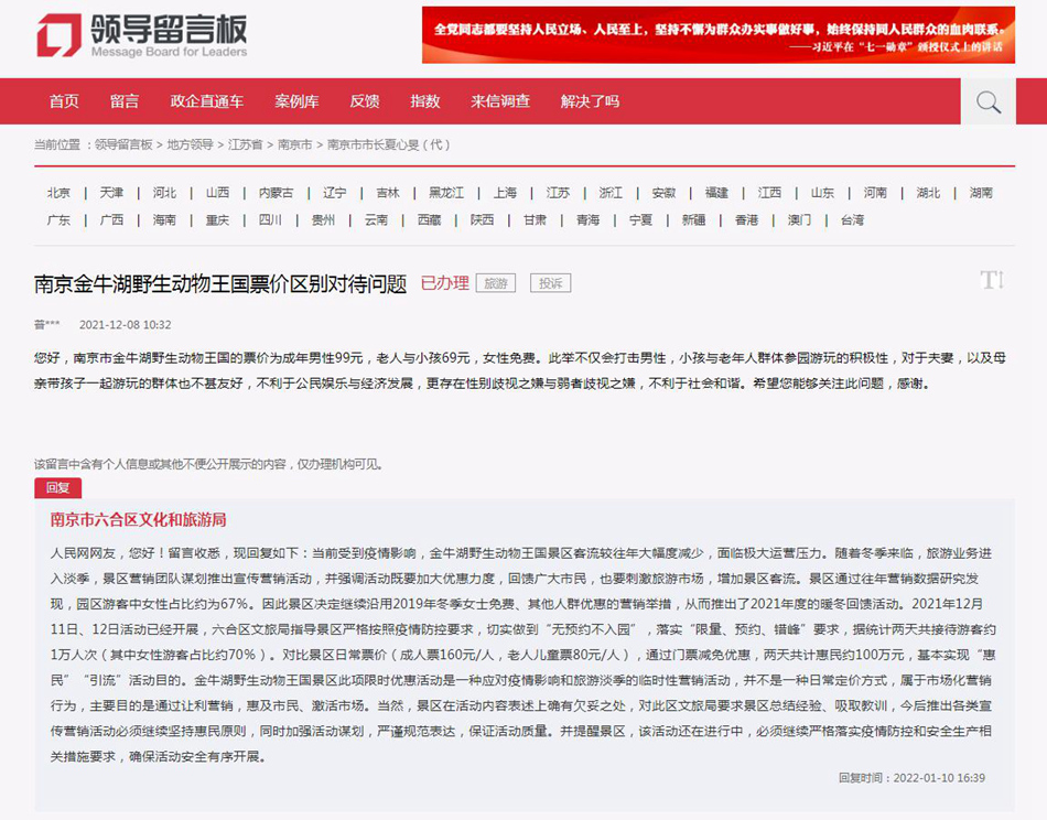 2021年12月8日,網友在人民網“領導留言板”向南京市市長留言稱,南京市金牛湖野生動物王國的票價為成年男性99元,老人與小孩69元,女性免費。此舉不僅打擊男性、小孩與老年人參園游玩的積極性,而且對于夫妻以及母親帶孩子一起游玩的群體也不甚友好,不利于公民娛樂與經濟發展,另外更存在性別歧視與弱者歧視之嫌,不利于社會和諧。