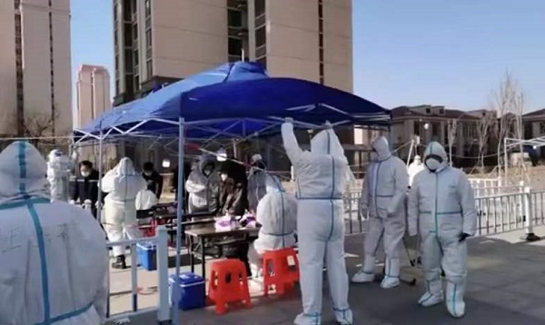 1月15日中午12點,在核酸檢測點位,22名“戰士”引導居民有序排隊、登記、采樣,維護現場秩序。