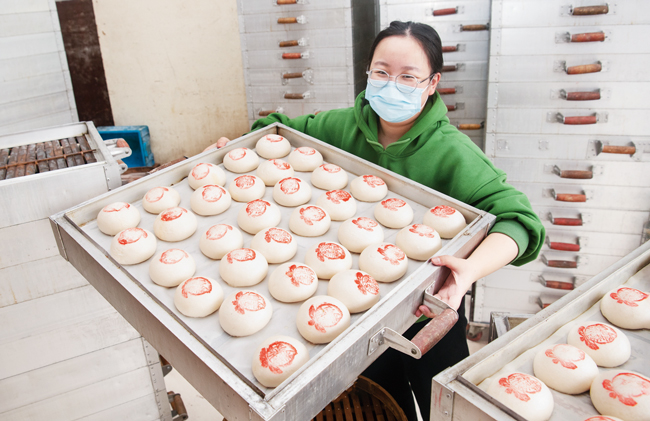 1月23日,金華市金東區赤松鎮仙橋饅頭店里熱氣騰騰,員工給剛蒸好的饅頭上蓋上紅印,寓意著新年“團團圓圓、蒸蒸日上”。隨著新春佳節臨近,赤松鎮仙橋各家饅頭店迎來了節前銷售高峰,饅頭夾扣肉、夾臭豆腐被稱作“金華漢堡”,成為春節餐桌上一道地方特色餐點。益泰饅頭店主人錢建濤表示,銷量主要集中在春節前一星期左右,晝夜不停一天要做5萬只以上。(時寬兵)