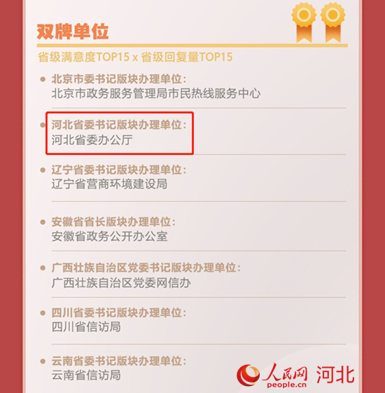 2021年,河北省委書記、省長留言版塊辦理單位雙雙入圍“2021年度人民網網上群眾工作民心匯聚單位”省級滿意度top15榜單。