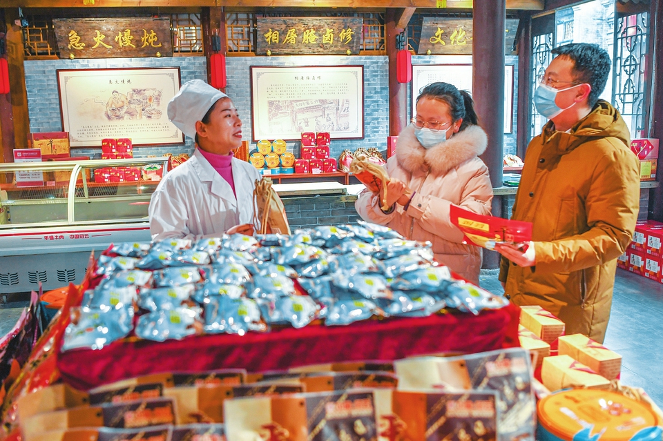 1月28日,游客在平遙古城一商店內購買年貨。虎年春節將至,平遙古城內花燈高掛,特色產品商店貨物充足,洋溢著濃濃的年味。(梁生仁攝)