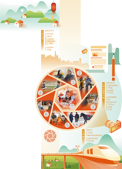 圖①至圖⑧依次為本報重慶分社記者常碧羅(左)、青海分社記者賈豐豐(右)、湖南分社記者王云娜(右)、內蒙古分社記者吳勇(左)、福建分社記者劉曉宇(左)、浙江分社記者竇瀚洋(左)、廣西分社記者祝佳祺(中)及人民網記者馮亞濤(左)在春節期間深入基層采訪。