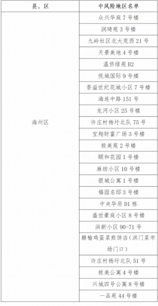 人民網南京3月8日電 (黃竹巖)江蘇連云港市突發新冠肺炎疫情應急處置指揮部辦公室3月8日發布通報,將頤和花園1號樓、麻紡小區10號樓、銀城公寓1號樓、福園名邸3號樓、中央華府D1棟、盛世豪庭小區8號樓、洪新小區90-71號、贛榆雞蛋菜煎餅店(洪門菜市場門口)、許莊村楊圩北隊51號、極美公寓4號樓、興城四號公寓8號樓、一品苑44號樓調整為中風險地區。其他地區風險等級不變。調整后連云港市現有24個中風險地區。