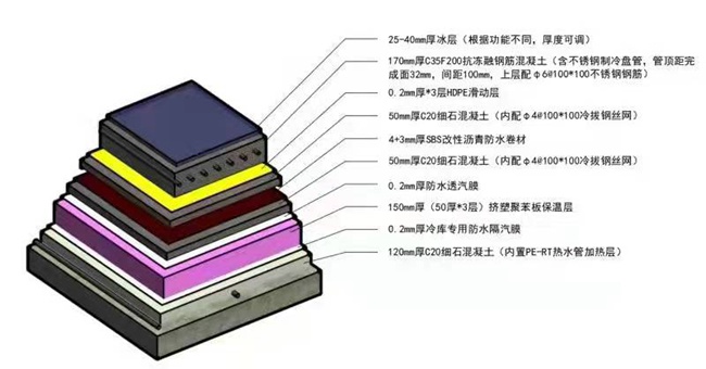 混凝土冰板層這道工序尤為重要,施工也最為艱苦。對李燕敏來說,冰板構造施工就如同制作“千層糕”:從下向上鋪設加熱層、防潮隔汽層、保溫層、隔離層、防水層、混凝土冰板層……55厘米厚的混凝土整整有9層,整個地面平整度要達到設計要求的精度,每個環節不容有絲毫閃失。