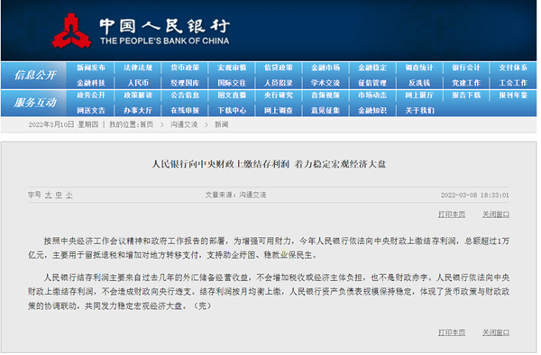 3月8日,財政部有關負責人就人民銀行上繳近年結存利潤問題答記者問時表示,安排特定國有金融機構和專營機構上繳利潤,是我國的慣例做法,也是統籌財政資源、跨年度調節資金的重要手段,其中包括中國煙草總公司、中投公司等,央行也是上繳單位之一。