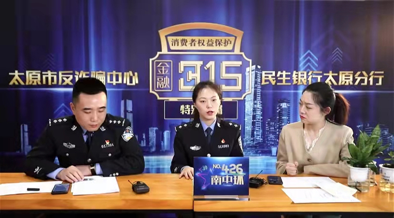 人民網太原3月15日電 為進一步增強人民群眾防范電信網絡詐騙意識,發揮公安機關和金融行業的宣傳合力,3月15日下午,太原市反詐騙中心與民生銀行太原分行聯合開展了“3·15”專題防范電信網絡詐騙直播活動,為廣大群眾帶來了滿滿的防詐騙“干貨”。