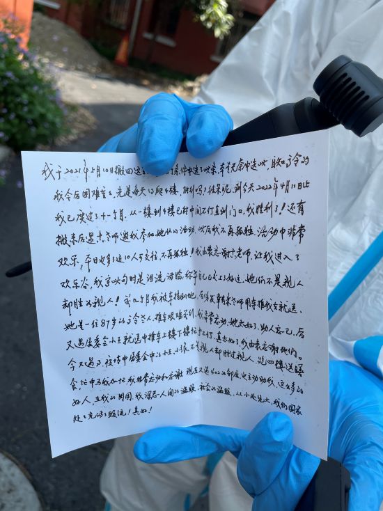 幾經(jīng)推辭,錢(qián)留在老人家手里,但她還執(zhí)拗地遞來(lái)兩封信,一封短的,本來(lái)包鈔票用的:這是給您們和廣大志愿者添些營(yíng)養(yǎng)品用,望勿拒。還有封長(zhǎng)信里提到,“疫情中,居委會(huì)的小王、小張,不是親人卻勝過(guò)親人,跑四樓送膳食,我非常感謝。”