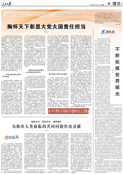 中國共產黨是為中國人民謀幸福、為中華民族謀復興的黨,也是為人類謀進步、為世界謀大同的黨。我們要拓展世界眼光,深刻洞察人類發展進步潮流,積極回應各國人民普遍關切,為解決人類面臨的共同問題作出貢獻,以海納百川的寬闊胸襟借鑒吸收人類一切優秀文明成果,推動建設更加美好的世界。深刻認識和把握“六個必須堅持”系列理論版今天推出第六期,圍繞“必須堅持胸懷天下”進行闡述。
