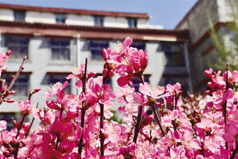 那么,去哪里查收這份“春日限定大禮包”呢?最近幾天,記者的朋友圈都被帕崩崗的美景霸屏了,一波又一波的朋友到這里打卡。除了去帕崩崗賞桃花,更不容錯過的一定是拉薩大街小巷以及公園中驚鴻一瞥的美景。宗角祿康公園植被繁茂、古樹較多,一到春季,玫粉色的榆葉梅綻放枝頭,層層花瓣在陽光的照耀下嬌俏動人,一樹粉色花朵倒映在幽綠的湖水中,盡顯詩意。此外,緊鄰羅布林卡的羅堆東路也有意想不到的美景,每到這個季節,紅葉李便會沿路盛開,淡粉色的花瓣搭配深紅色的花蕊,甚是好看。金珠西路沿途的景色也令人耳目一新,淡粉色的花朵肆意綻放,等紅燈時的心情因這些花朵變得不再焦灼。