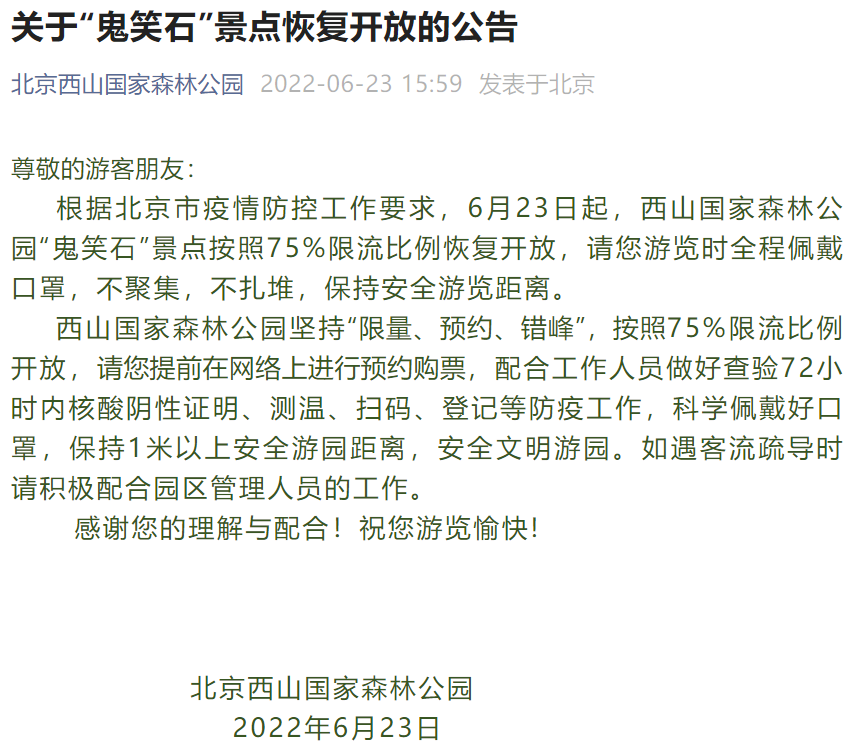 央廣網北京6月23日消息 據北京西山國家森林公園微信公眾號消息,根據北京市疫情防控工作要求,自6月23日起,西山國家森林公園“鬼笑石”景點按照75%限流比例恢復開放。