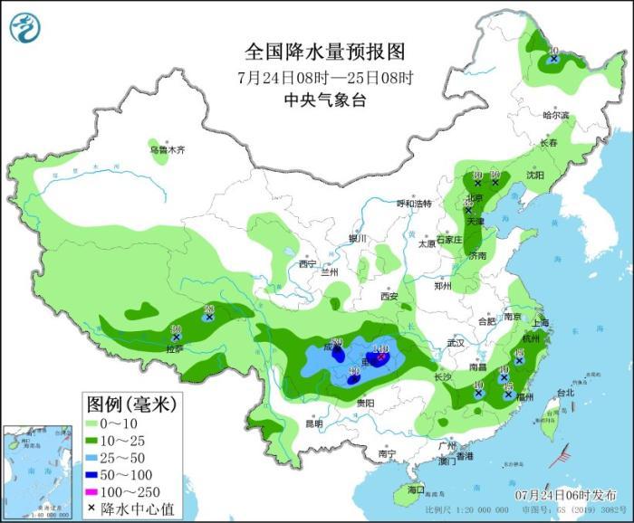 圖2 全國降水量預報圖(7月24日08時-25日08時)
