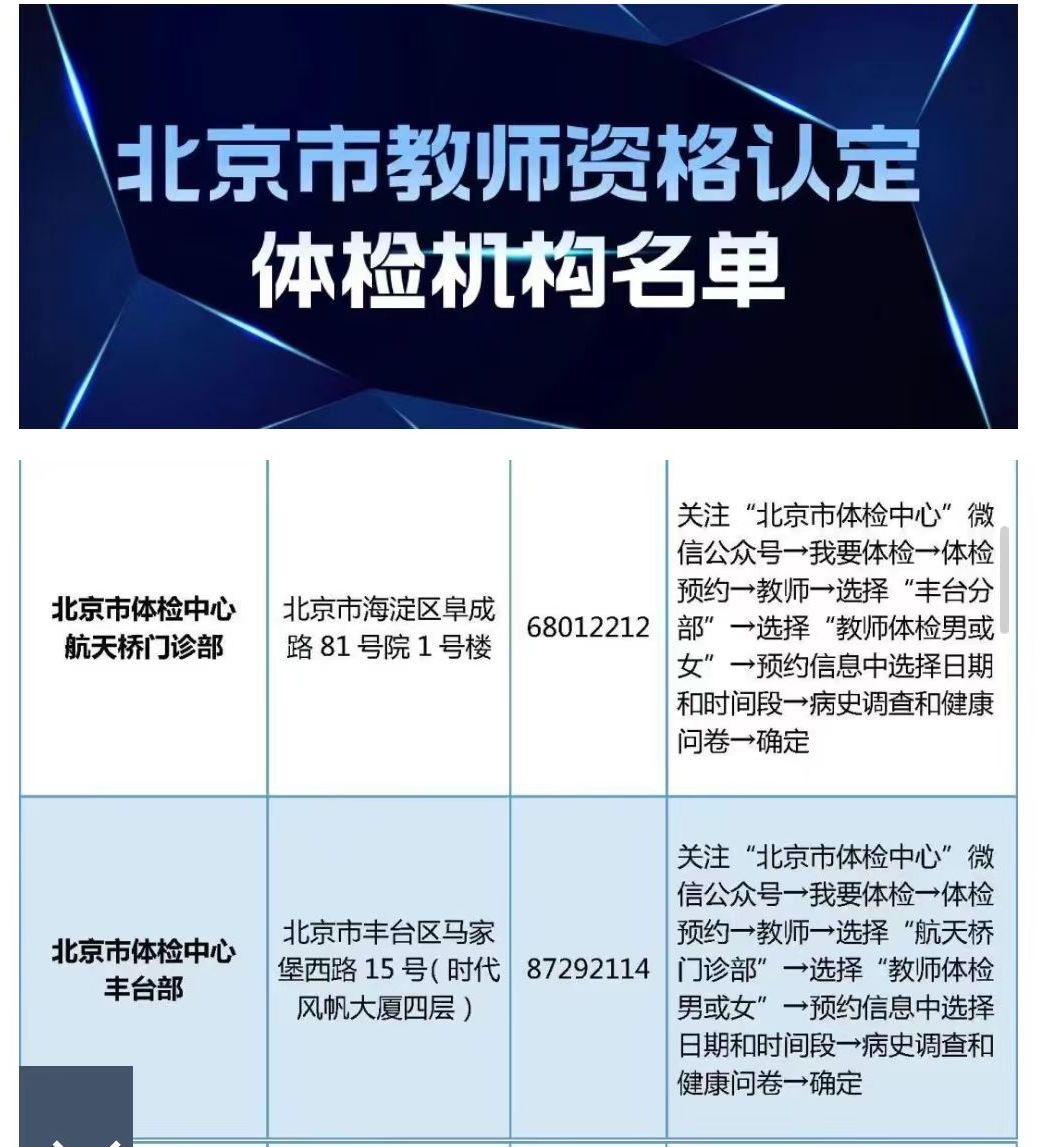 尚未進(jìn)行體檢的請自行與體檢機(jī)構(gòu)聯(lián)系完成體檢。北京市體檢中心將于3月中下旬在豐臺部、航天橋門診部和馬甸部舉行多場教師資格認(rèn)定體檢專場。具體時間安排可聯(lián)系相應(yīng)機(jī)構(gòu)咨詢。