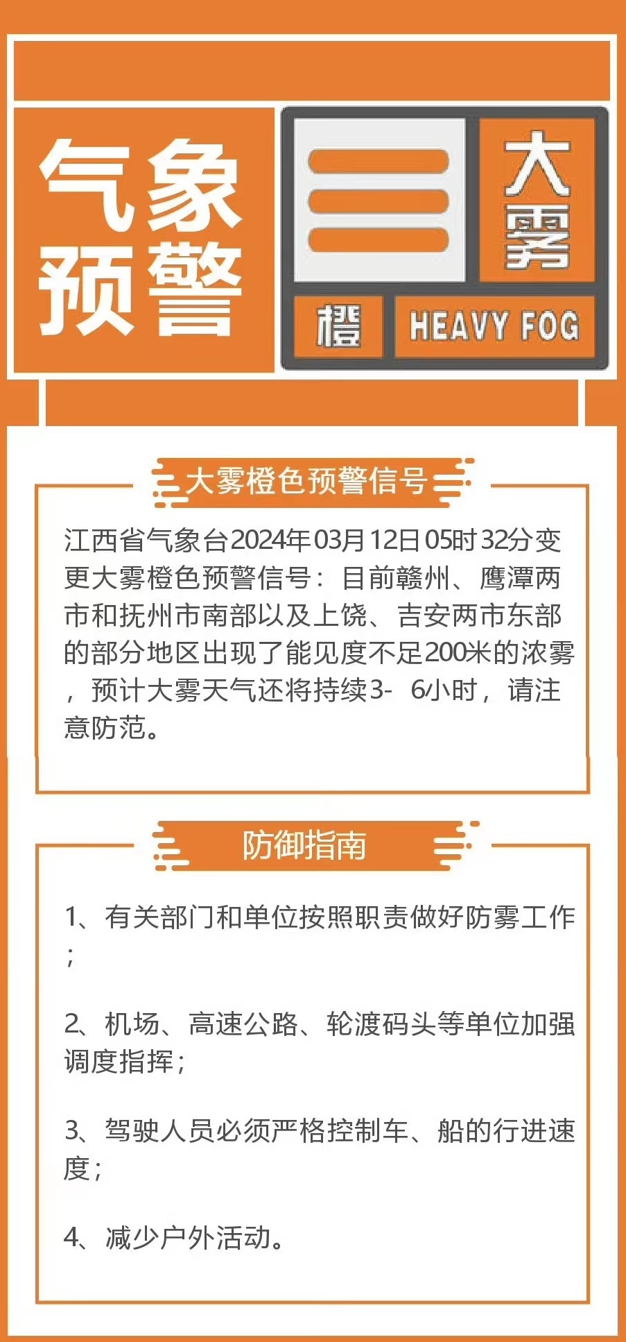 江西省氣象臺2024年3月12日5時32分變更大霧橙色預警信號:目前贛州、鷹潭兩市和撫州市南部以及上饒、吉安兩市東部的部分地區出現了能見度不足200米的濃霧,預計大霧天氣還將持續3~6小時,請注意防范。
