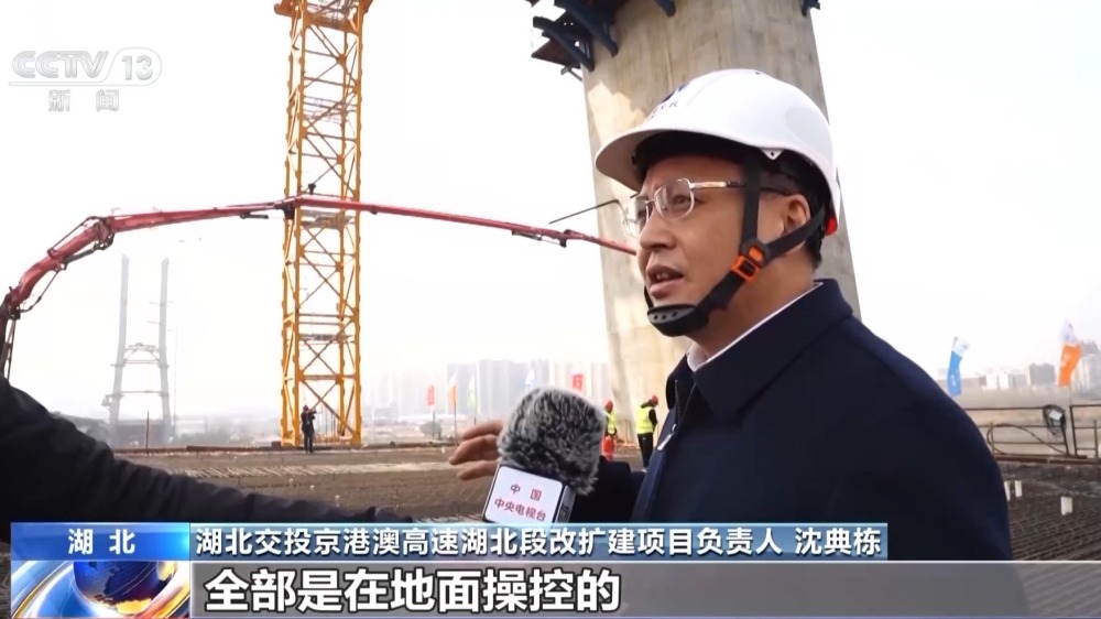 湖北交投京港澳高速湖北段改擴建項目負責人 沈典棟:這個塔頂上就是輕型智能筑塔機,是采用智能建造的技術,全都是在地面操控的,塔上無人,這樣就保證了我們工人安全。我們這個智能的布料系統,布料很均勻,讓混凝土不產生離析。