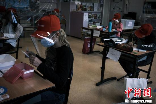 當地時間5月12日,法國中部圣埃蒂安附近的拉格蘭德克羅伊市,當地小學生戴著統一發放的面罩上課。據報道,當地時間5月11日,法國開始逐步“解封”,結束已經持續55天的全國“封城”狀態。